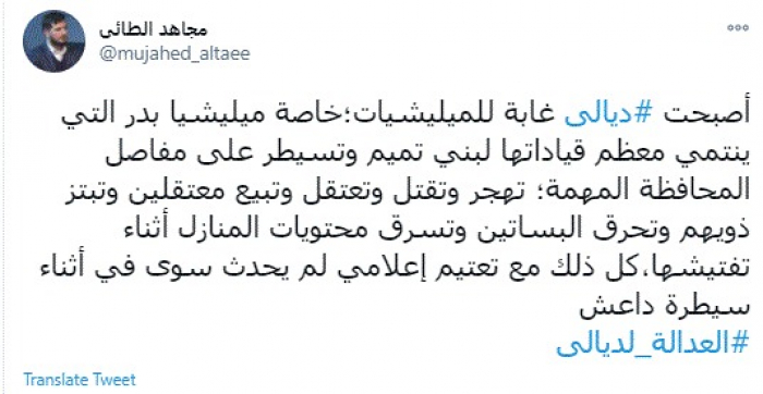 وكتب في تغريدة عبر "تويتر" رصدها "المشهد العربي": "أصبحت ديالى غابة للميليشيات؛خاصة ميليشيا بدر التي ينتمي معظم قياداتها لبني تميم وتسيطر على مفاصل المحافظة المهمة؛ تهجر وتقتل وتعتقل وتبيع معتقلين وتبتز ذويهم وتحرق البساتين وتسرق محتويات المنازل أثناء تفتيشها، كل ذلك مع تعتيم إعلامي لم يحدث سوى في أثناء سيطرة داعش".