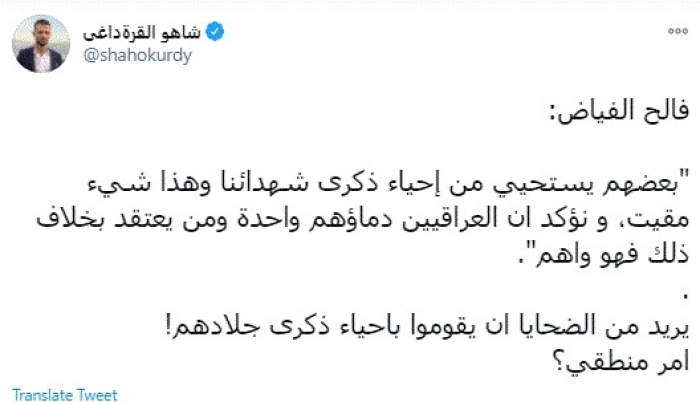 وقال في تغريدة عبر "تويتر" رصدها "المشهد العربي": "فالح الفياض: بعضهم يستحيي من إحياء ذكرى شهدائنا وهذا شيء مقيت، و نؤكد أن العراقيين دماؤهم واحدة ومن يعتقد بخلاف ذلك فهو واهم. يريد من الضحايا أن يقوموا باحياء ذكرى جلادهم أمر منطقي؟".