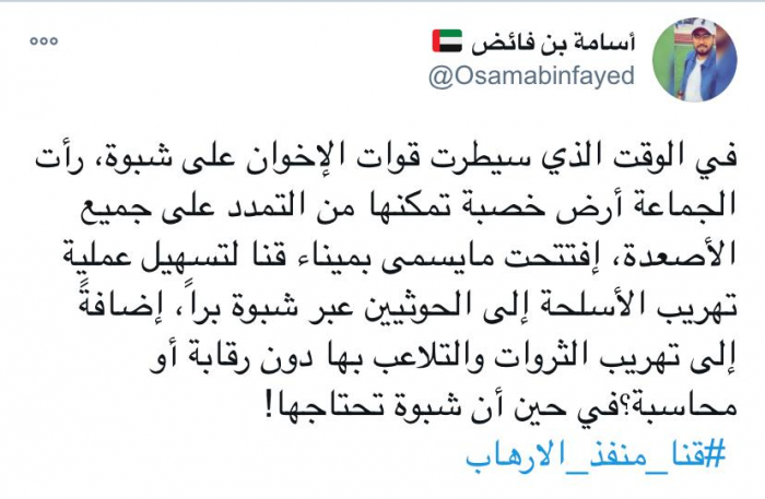 وأكد في تغريدة على حسابه بموقع التدوين المصغر تويتر، أنه: "في الوقت الذي سيطرت قوات الإخوان على شبوة، رأت الجماعة أرضا خصبة تمكنها من التمدد على جميع الأصعدة".