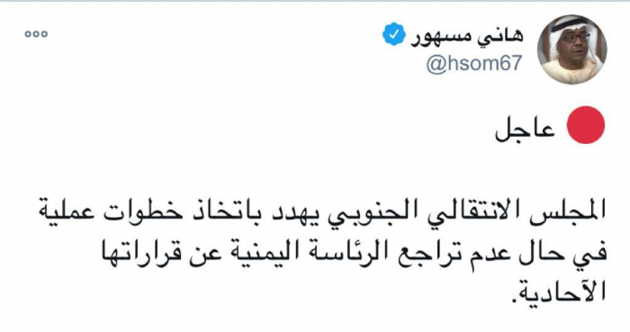 وأوضح في تغريدة على حسابه بموقع التدوين المصغر تويتر، أن: "المجلس الانتقالي الجنوبي يهدد باتخاذ خطوات عملية في حال عدم تراجع الرئاسة اليمنية عن قراراتها الآحادية".