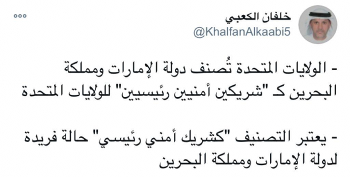 قال الخبير الاستراتيجي خلفان الكعبي إن الولايات المتحدة الأمريكية تصنف الإمارات والبحرين كشركاء أمنيين رئيسيين في المنطقة.