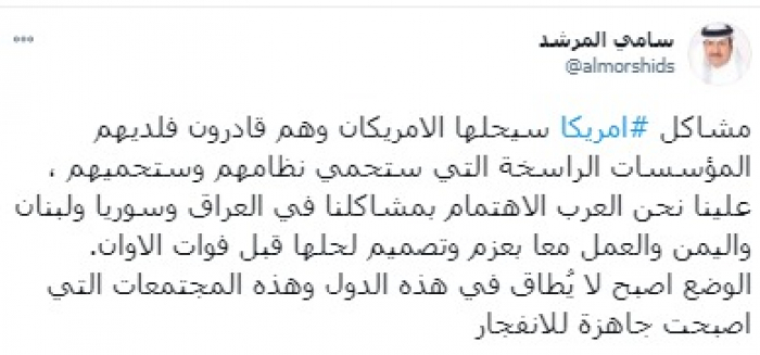 وأشار في تغريدة على حسابه بموقع التدوين المصغر تويتر، اليوم إلى أن: "مشاكل أمريكا سيحلها الأمريكان وهم قادرون فلديهم المؤسسات الراسخة التي ستحمي نظامهم وستحميهم".