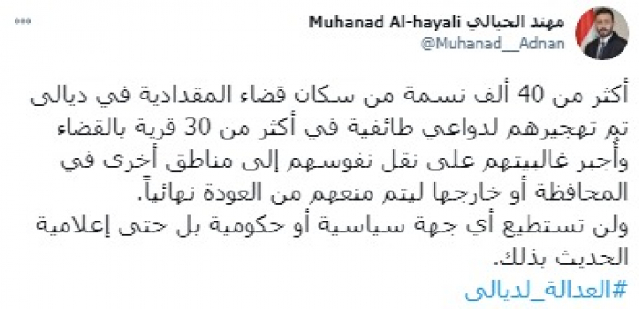وأكد في تغريدة على حسابه بموقع التدوين المصغر تويتر، أن: "أكثر من 40 ألف نسمة من سكان قضاء المقدادية في ديالى تم تهجيرهم لدواعي طائفية في أكثر من 30 قرية بالقضاء".