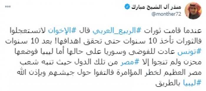 وقال في تغريدة على حسابه بموقع التدوين المصغر تويتر، اليوم إنه: "عندما قامت ثورات الربيع قال الإخوان لا تستعجلوا فالثورات تأخذ 10 سنوات حتى تحقق أهدافها!".