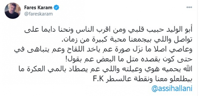 وكتب فارس، عبر حسابه على تويتر، قائلا: "أبو الوليد.. حبيب قلبي، ومن أقرب الناس، ونحن دايما على تواصل واللي بيجمعنا محبة كبيرة من زمان".