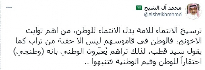 وقال في تغريدة عبر "تويتر" رصدها "المشهد العربي": "ترسيخ الانتماء للامة بدل الانتماء للوطن، من اهم ثوابت الاخونج، فالوطن في قاموسهم ليس الا حفنة من تراب كما يقول سيد قطب، لذلك تراهم يُعيّرون الوطني بأنه (وطنجي) احتقاراً للوطن وقيم الوطنية فتنبهوا".