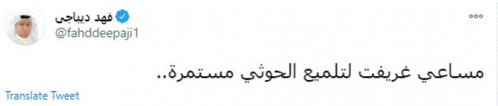 وقال في تغريدة عبر "تويتر" رصدها "المشهد العربي": "مساعي غريفيث لتلميع الحوثي مستمرة".