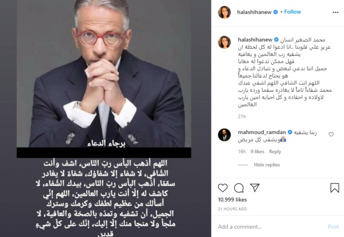 أضافت حلا: "فهل ممكن تدعوا له معايا، جميل إننا ندعي لبعض ونتبادل الدعاء وهو يحتاج لدعائنا جميعاً، اللهم أنت الشافي اللهم اشفي عبدك محمد شفاءاً تاماً لا يغادره سقما ورده يا رب لاولاده وأحفاده وكل أحبابه أمين يارب العالمين".