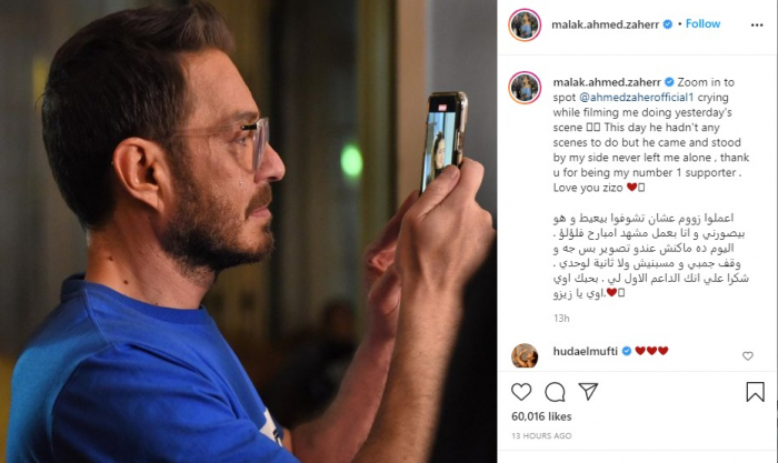 علقت ملك على الصورة: "اعملوا زووم عشان تشوفوا بيعيط وهو بيصورني وأنا بعمل مشهد إمبارح في لؤلؤ، اليوم ده ماكنش عنده تصوير بس جه ووقف جمبي ومسابنيش ولا ثانية لوحدي، شكرا علي إنك الداعم الأول لي بحبك أوي أوي يا زيزو".