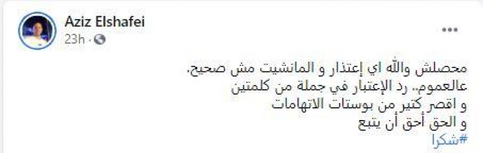 بينما قال الملحن عزيز الشافعي عبر حسابه الشخصي على "فيسبوك": "محصلش والله أي اعتذار والمانشيت مش صحيح.. على العموم.. رد الاعتبار في جملة من كلمتين.. وأقصر كتير من بوستات الاتهامات.. والحق أحق أن يتبع.. شكرا".