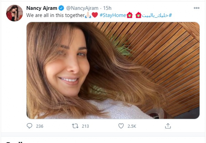 نشرت نانسي صورة لها من داخل منزلها، عبر حسابها الرسمي بموقع "تويتر"، وعلقت: "خليك بالبيت، كلنا معًا في هذا".