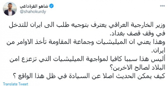وقال في تغريدة عبر "تويتر" رصدها "المشهد العربي": "وزير الخارجية العراقي يعترف بتوجيه طلب الى ايران للتدخل في وقف قصف بغداد. وهذا يعني أن الميليشيات وجماعة المقاومة تأخذ الأوامر من إيران".