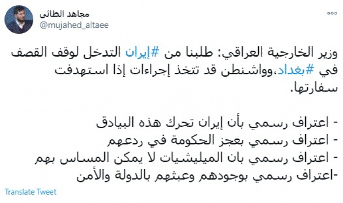 وكتب في تغريدة عبر "تويتر" رصدها "المشهد العربي": "وزير الخارجية العراقي: طلبنا من إيران التدخل لوقف القصف في بغداد،وواشنطن قد تتخذ إجراءات إذا استهدفت سفارتها. اعتراف رسمي بأن إيران تحرك هذه البيادق وعجز الحكومة في ردعهم، وبأن الميليشيات لا يمكن المساس بهم، وبأن بوجودهم وعبثهم بالدولة والأمن".