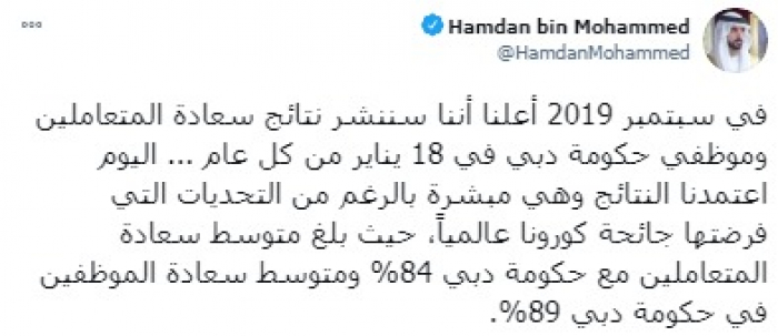 وقال في تغريدة على حسابه بموقع التدوين المصغر تويتر، اليوم إنه: "في سبتمبر 2019 أعلنا أننا سننشر نتائج سعادة المتعاملين وموظفي حكومة دبي في 18 يناير من كل عام".