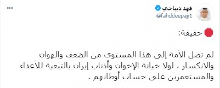 وشدد في تغريدة على حسابه بموقع التدوين المصغر تويتر، اليوم على أنه: "لم تصل الأمة إلى هذا المستوى من الضعف والهوان والانكسار، لولا خيانة الإخوان وأذناب إيران بالتبعية للأعداء والمستعمرين على حساب أوطانهم".