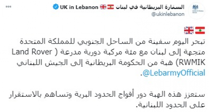 ونوهت في تغريدة على حسابها بموقع التدوين المصغر تويتر، اليوم بأنه: "تبحر اليوم سفينة من الساحل الجنوبي للمملكة المتحدة متجهة إلى لبنان مع مئة مركبة دورية مدرعة (Land Rover RWMIK)".
