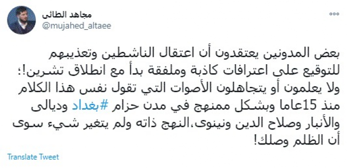 وكتب في تغريدة عبر "تويتر" رصدها "المشهد العربي": "بعض المدونين يعتقدون أن اعتقال الناشطين وتعذيبهم للتوقيع على اعترافات كاذبة وملفقة بدأ مع انطلاق تشرين!؛ ولا يعلمون أو يتجاهلون الأصوات التي تقول نفس هذا الكلام منذ 15عاما وبشكل ممنهج في مدن حزام بغداد وديالى والأنبار وصلاح الدين ونينوى،النهج ذاته ولم يتغير شيء سوى أن الظلم وصلك".