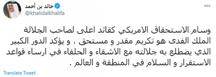 وقال في تغريدة عبر "تويتر" رصدها "المشهد العربي": " وسام الاستحقاق الأمريكي كقائد أعلى لصاحب الجلالة الملك الفدى هو تكريم مقدر ومستحق، ويؤكد الدور الكبير الذي يضطلع به جلالته مع الأشقاء و الحلفاء في إرساء قواعد الاستقرار والسلام في المنطقة والعالم".