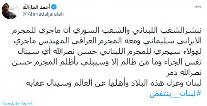 وكتب في تغريدة عبر "تويتر" رصدها "المشهد العربي": "نبشر الشعب اللبناني والشعب السوري أن ما جري للمجرم الإيراني سليماني ومعه المجرم العراقي المهندس ما جري لهؤلاء سيجري للمجرم اللبناني حسن نصرالله أي سينال نفس الجزاء وما من ظالم إلا وسيبلي بأظلم".