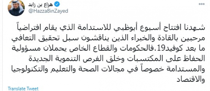 وقال في تغريدة عبر "تويتر" رصدها "المشهد العربي": "شهدنا افتتاح أسبوع أبوظبي للاستدامة الذي يقام افتراضياً مرحبين بالقادة والخبراء الذين يناقشون سبل تحقيق التعافي ما بعد كوفيد19،فالحكومات والقطاع الخاص يحملان مسؤولية الحفاظ على المكتسبات وخلق الفرص التنموية الجديدة والمستدامة خصوصاً في مجالات الصحة والتعليم والتكنولوجيا والاقتصاد".