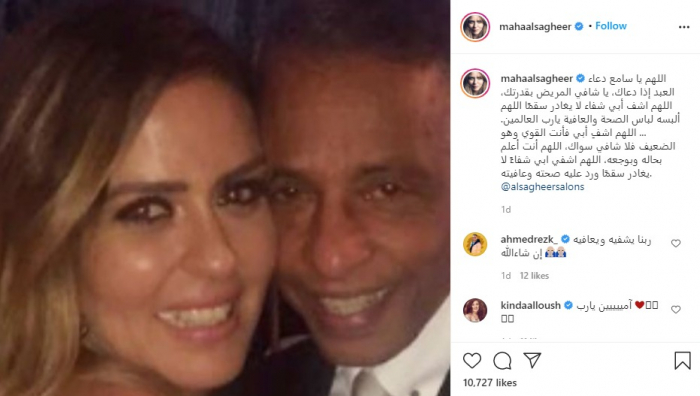 ونشرت "مها"، صورة تجمعها بوالدها عبر حسابها بموقع "إنستجرام، وعلقت: "اللهم يا سامع دعاء العبد إذا دعاك، يا شافي المريض بقدرتك، اللهم اشف أبي شفاء لا يغادر سقمًا اللهم ألبسه لباس الصحة والعافية يارب العالمين، اللهم اشفِ أبي فأنت القوي وهو الضعيف فلا شافي سواك، اللهم أنت أعلم بحاله وبوجعه، اللهم اشفي ابي شفاءً لا يغادر سقمًا ورد عليه صحته وعافيته".