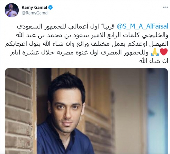 وكتب جمال، عبر حسابه على "تويتر": "قريبًا.. أول أعمالي للجمهور السعودي والخليجي، كلمات الرائع الأمير سعود بن محمد بن عبد الله الفيصل.. أوعدكم بعمل مختلف ورائع، وإن شاء الله ينول إعجابكم".