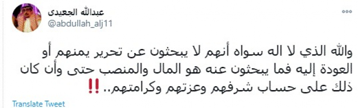 وقال في تغريدة عبر "تويتر" رصدها "المشهد العربي": "والله الذي لا إله سواه أنهم لا يبحثون عن تحرير يمنهم أو العودة إليه فما يبحثون عنه هو المال والمنصب حتى وأن كان ذلك على حساب شرفهم وعزتهم وكرامتهم".