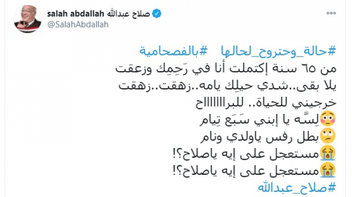 وغرد "عبدالله" قائلًا: "من ٦٥ سنة اكتملت أنا في رَحِمِك وزعقت، يلا بقى شدي حيلِك يامه زهقت زهقت.. خرجيني للحياة للبراح، لِسَّه يا إبني سَبَع تِيام، بطل رفس ياولدي ونام، مستعجل على إيه ياصلاح".