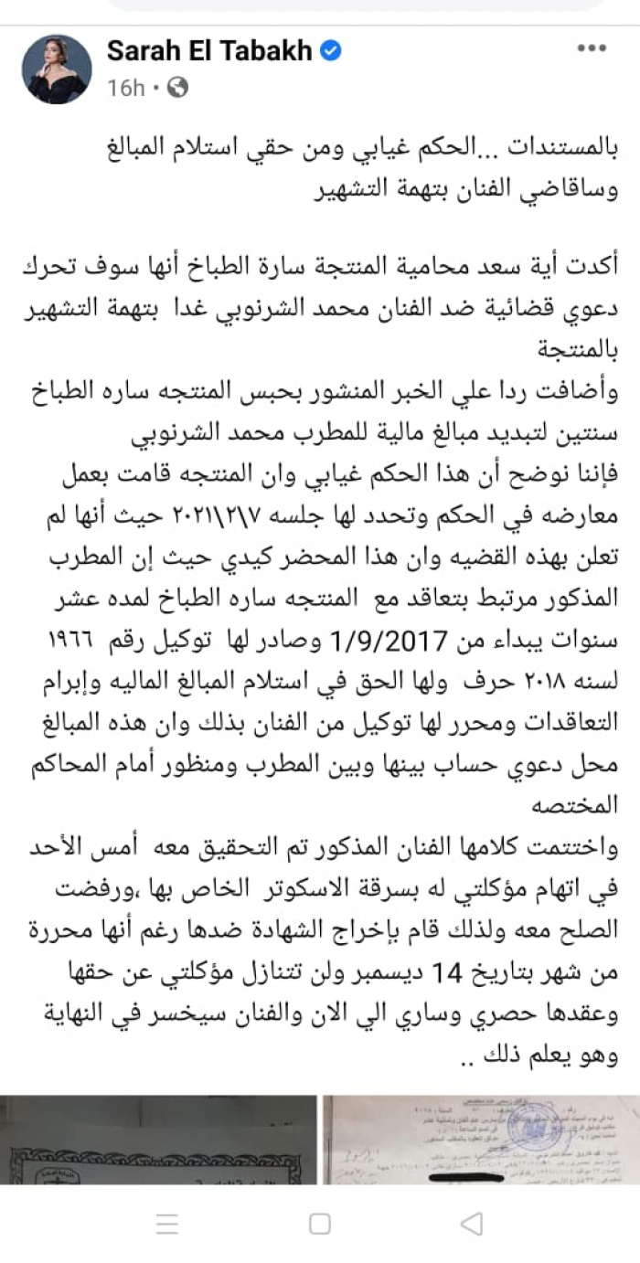 وجاء في البيان: "أكدت آية سعد محامية المنتجة سارة الطباخ أنها سوف تحرك دعوى قضائية ضد الفنان محمد الشرنوبي غدا بتهمة التشهير بالمنتجة، وردا على الخبر المنشور بحبس المنتجة سارة الطباخ سنتين لتبديد مبالغ مالية للمطرب محمد الشرنوبي، فإننا نوضح أن هذا الحكم غيابي وأن المنتجة قامت بعمل معارضة في الحكم وتحدد لها جلسة ٧\٢\٢٠٢١".