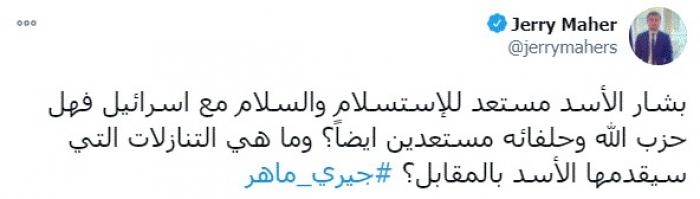 وقال في تغريدة عبر "تويتر" رصدها "المشهد العربي": "بشار الأسد مستعد للإستسلام والسلام مع اسرائيل فهل حزب الله وحلفائه مستعدين أيضاً؟ وما هي التنازلات التي سيقدمها الأسد بالمقابل؟".