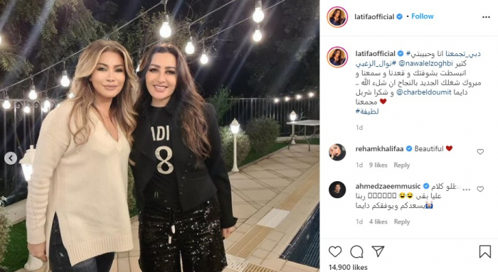وعلقت "لطيفة"، على الصور قائلة: "دبي تجمعنا أنا وحبيبتي نوال الزغبي، كتير انبسطت بشوفتك وقعدنا وسمعنا ومبروك شغلك الجديد بالنجاح إن شاء الله".