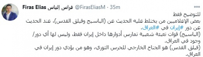 وقال في تغريدة عبر "تويتر" رصدها "المشهد العربي": "للتوضيح فقط بعض الإعلاميين من يختلط عليه الحديث عن (الباسيج وفيلق القدس)، عند الحديث عن دور إيران في العراق".