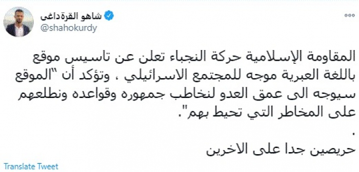 وقال في تغريدة عبر "تويتر" رصدها "المشهد العربي": "المقاومة الإسلامية حركة النجباء تعلن عن تأسيس موقع باللغة العبرية موجه للمجتمع الإسرائيلي، وتؤكد أن الموقع سيوجه الى عمق العدو لنخاطب جمهوره وقواعده ونطلعهم على المخاطر التي تحيط بهم.. حريصين جدًا على الآخرين".