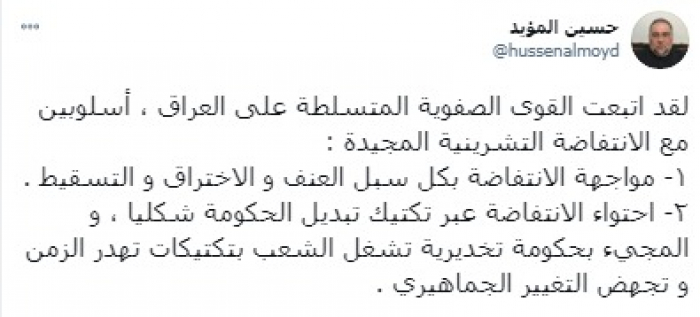وأكد في تغريدة على حسابه بموقع التدوين المصغر تويتر، اليوم أنه: "لقد اتبعت القوى الصفوية المتسلطة على العراق ، أسلوبين مع الانتفاضة التشرينية المجيدة، ١- مواجهة الانتفاضة بكل سبل العنف و الاختراق و التسقيط، ٢- احتواء الانتفاضة عبر تكتيك تبديل الحكومة شكليا ، و المجيء بحكومة تخديرية تشغل الشعب بتكتيكات تهدر الزمن و تجهض التغيير الجماهيري".