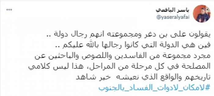 وأضاف: "هذا ليس كلامي، تاريخهم والواقع الذي نعيشه خير شاهد"، مختتما: "لا مكان لأدوات الفساد بالجنوب".