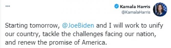 وأكدت في تغريدة على حسابها بموقع التدوين المصغر تويتر، اليوم أنه: "سأعمل وجو بايدن على توحيد بلادنا والتصدي للتحديات التي تواجه أمتنا وتجديد الوعد لأمريكا".