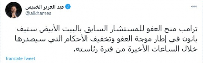 وقال في تغريدة عبر "تويتر" رصدها "المشهد العربي": "ترامب منح العفو للمستشار السابق بالبيت الأبيض ستيف بانون في إطار موجة العفو وتخفيف الأحكام التي سيصدرها خلال الساعات الأخيرة من فترة رئاسته".