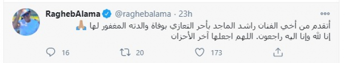 وغرد "راغب"، عبر حسابه الرسمي بموقع تويتر: " أتقدم من أخي الفنان راشد الماجد بأحر التعازي بوفاة والدته المغفور لها، إنا لله وإنا إليه راجعون، اللهم أجعلها أخر الأحزان".