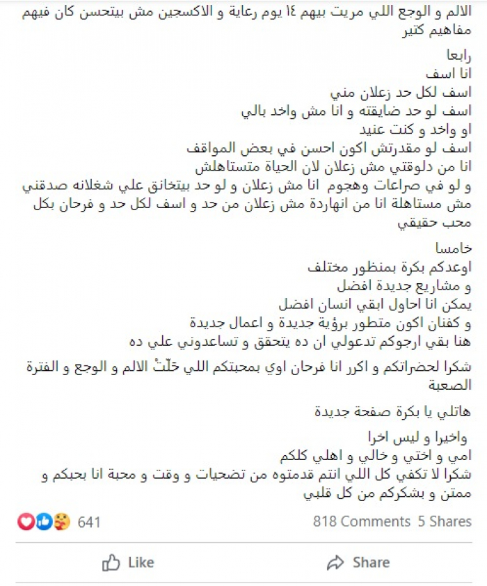 واختتم حديثه قائلا: "أوعدكم بكرة بمنظور مختلف.. ومشاريع جديدة أفضل.. يمكن أنا أحاول أبقى إنسان أفضل.. وكفنان أكون متطور برؤية جديدة وأعمال جديدة.. هنا بقي أرجوكم تدعوا لي إن ده يتحقق وتساعدوني على ده.. شكرا لحضراتكم و اكرر انا فرحان اوي بمحبتكم اللي حَلّتْ الالم و الوجع و الفترة الصعبة، هاتلي يا بكرة صفحة جديدة.. واخيرا و ليس اخرا امي و اختي و خالي و اهلي كلكم شكرا لا تكفي كل اللي انتم قدمتوه من تضحيات و وقت و محبة انا بحبكم و ممتن و بشكركم من كل قلبي".