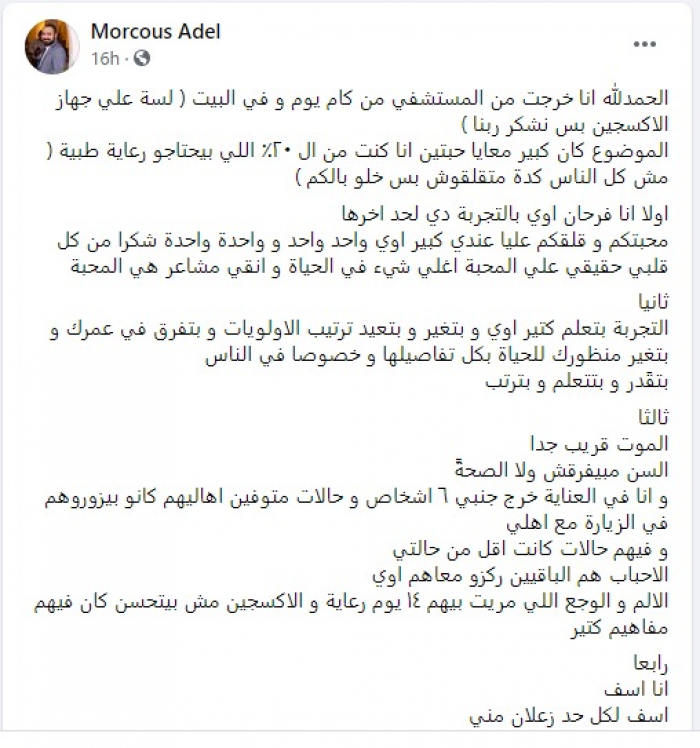 وكتب "مرقس": "أنا الحمد لله خرجت من المستشفى من كام يوم وفي البيت، لسه على جهاز الأكسجين بس نشكر ربنا، الموضوع كان كبير معايا حبتين، أنا كنت من الـ 20٪ اللي بيحتاجوا رعاية طبية، مش كل الناس كده متقلقوش بس خلوا بالكم".