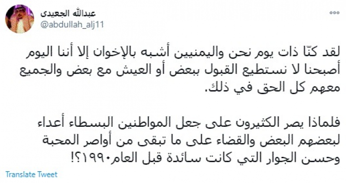 وقال في تغريدة عبر "تويتر" رصدها "المشهد العربي": "لقد كنّا ذات يوم نحن واليمنيين أشبه بالإخوان إلا أننا اليوم أصبحنا لا نستطيع القبول ببعض أو العيش مع بعض والجميع معهم كل الحق في ذلك".