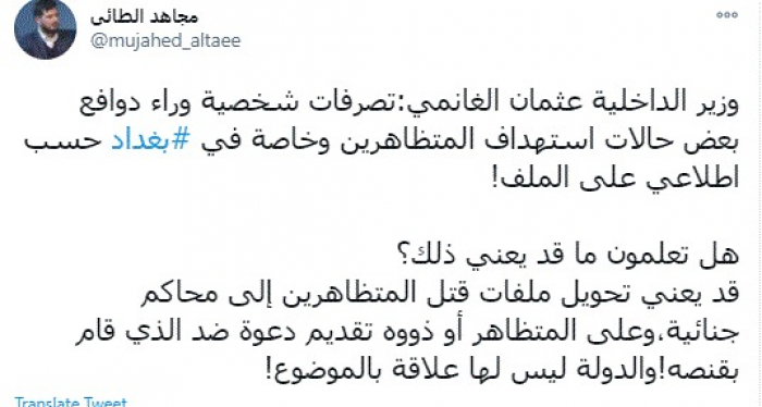 وقال في تغريدة عبر "تويتر" رصدها "المشهد العربي": "وزير الداخلية عثمان الغانمي: تصرفات شخصية وراء دوافع بعض حالات استهداف المتظاهرين وخاصة في بغداد حسب إطلاعي على الملف! هل تعلمون ما قد يعني ذلك؟ قد يعني تحويل ملفات قتل المتظاهرين إلى محاكم جنائية،وعلى المتظاهر أو ذووه تقديم دعوة ضد الذي قام بقنصه! والدولة ليس لها علاقة بالموضوع".