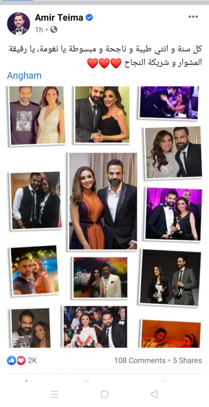 ونشر "طعيمة"، صورة مجمعة تضم عدة صور له بصحبة أنغام، عبر حسابه بموقع "فيس بوك"، وعلق: "كل سنة وإنتِ طيبة وناجحة ومبسوطة يا نغومة، يا رفيقة المشوار وشريكة النجاح".