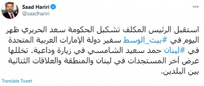 وقال في تغريدة عبر "تويتر" رصدها "المشهد العربي": "استقبل الرئيس المكلف تشكيل الحكومة سعد الحريري ظهر اليوم في بيت الوسط سفير دولة الإمارات العربية المتحدة في لبنان حمد سعيد الشامسي في زيارة وداعية، تخللها عرض آخر المستجدات في لبنان والمنطقة والعلاقات الثنائية بين البلدين".