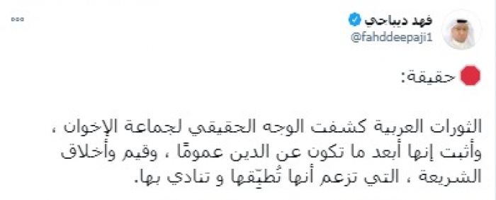 ورأى في تغريدة على حسابه بموقع التدوين المصغر تويتر، اليوم أن: "الثورات العربية كشفت الوجه الحقيقي لجماعة الإخوان، وأثبت إنها أبعد ما تكون عن الدين عمومًا، وقيم وأخلاق الشريعة، التي تزعم أنها تُطبِّقها و تنادي بها".