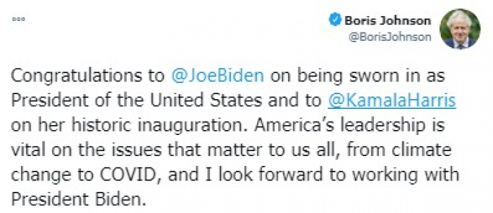هنأ رئيس الوزراء البريطاني بوريس جونسون الرئيس الأمريكي جو بايدن ونائبته كامالا هاريس على أدائهما اليمين الدستورية، معربا عن تطلعه للعمل معهما.