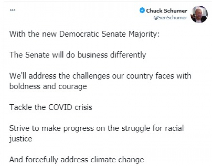وشدد في تغريدة على حسابه بموقع التدوين المصغر تويتر، على أنه: "مع الأغلبية الديمقراطية الجديدة في مجلس الشيوخ، سيقوم المجلس بعمله بشكل مختلف".