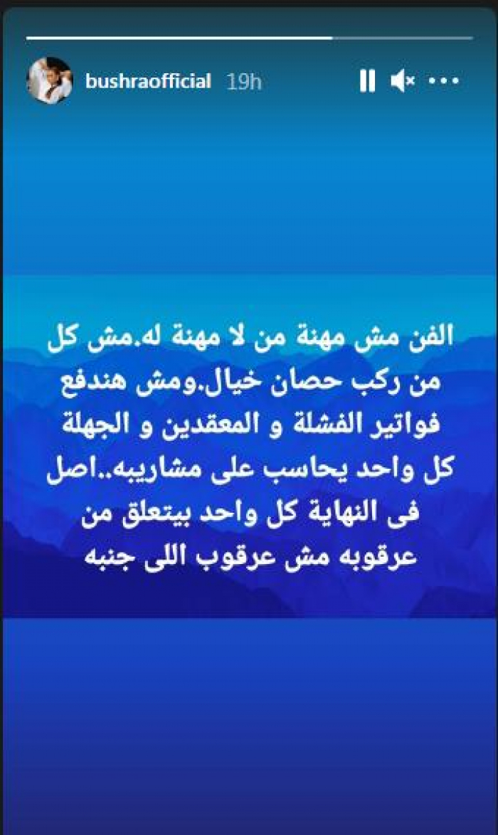 وكتبت بشرى، عبر خاصية "القصص القصيرة" على حسابها بموقع "إنستجرام": "الفن مش مهنة من لا مهنة له، مش كل من ركب حصان خیال، ومش هندفع فواتير الفشلة والمعقدين والجهلة، كل واحد يحاسب على مشاريبه، أصل في النهاية كل واحد بيتعلق من عرقوبه، مش عرقوب اللي جنبه".