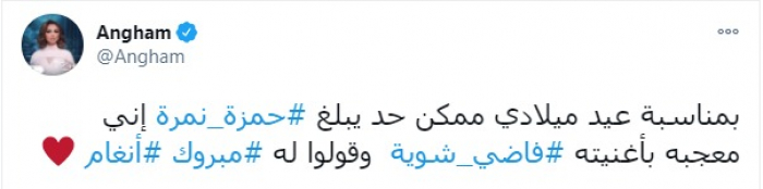 وكتبت أنغام، عبر حسابها على تويتر، قائلة: "بمناسبة عيد ميلادي.. ممكن حد يبلغ حمزة نمرة إني معجبة بأغنيته (فاضي شوية)..وقولوا له مبروك، أنغام ".