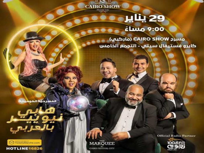 أعلن الحساب الرسمي لمسرح "كايرو شو" عن موعد عرض مسرحية "هابي نيو يير بالعربي" بكايرو فيستيفال في التجمع الخامس بالقاهرة.